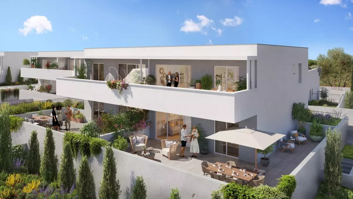 Ce programme neuf à Agde se déploie en plusieurs volumes bas, intégrés dans un environnement pavillonnaire afin de préserver l'intimité des habitants. La résidence est organisée en 5 bâtiments répartis autour d'espaces verts soignés et de cheminements piétons; une implantation étudiée pour favoriser la tranquillité et l'harmonie avec le quartier. Elle se compose de 24 appartements du T2 au T4, dont les surfaces varient d'environ 42 m² à 80,7 m², et qui répondent aux attentes des primo-accédants comme des familles à la recherche de confort.